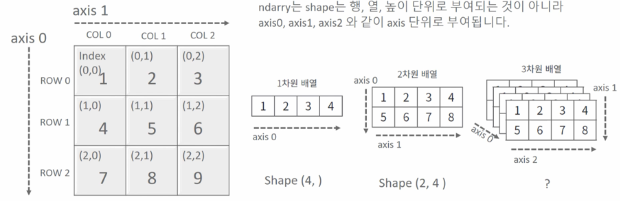axis는 축이 지 행과 열이 아니다. 2차원 ndarray에서는 행과 열이 축이 되겠지만 다차원에서는 행과 열만이 축이 되지 않기 때문에 일정수준 머신러닝과 딥러닝을 공부했다면 차이를 알고 있어야 한다.