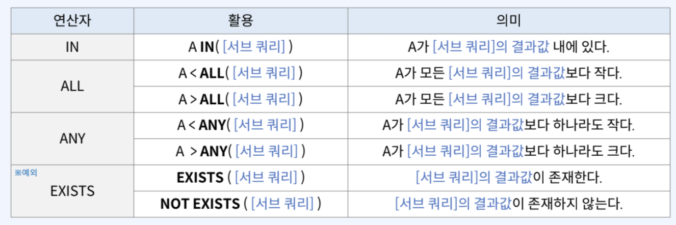 서브쿼리에 사용하는 연산자 - 주요 연산자