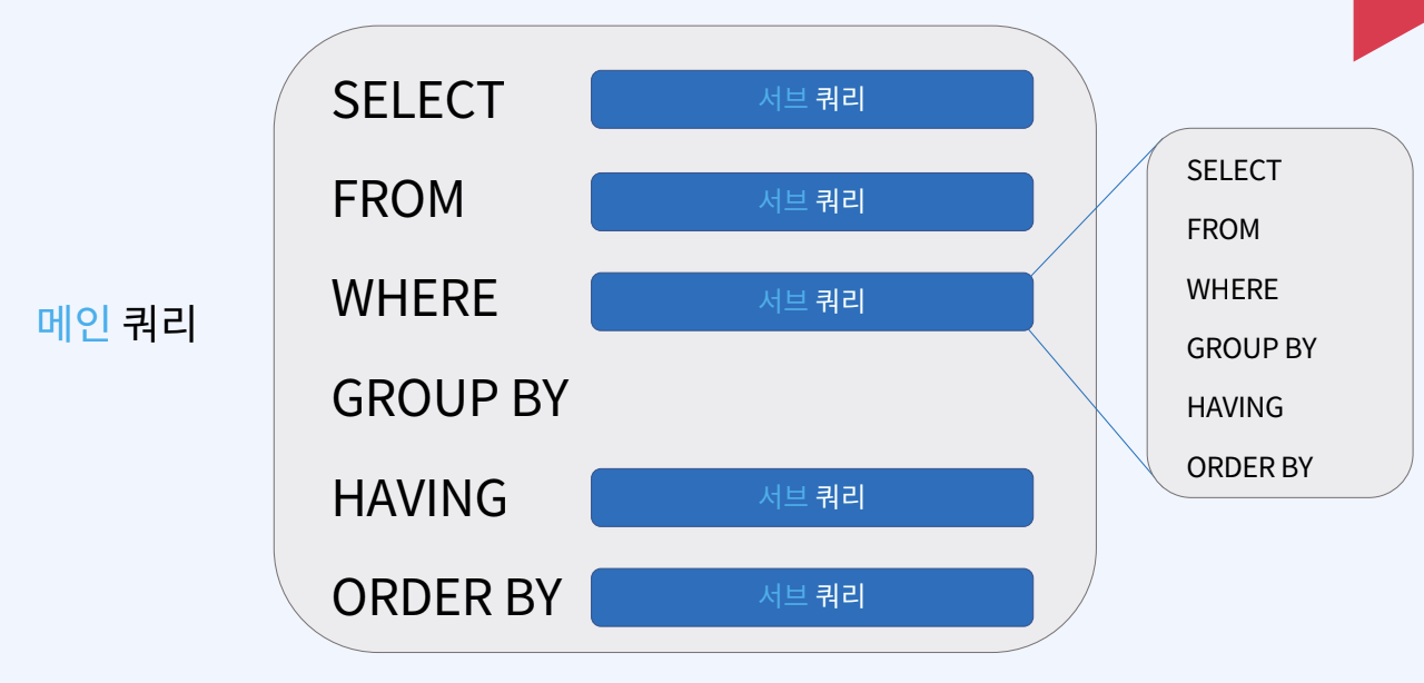 서브쿼리란 메인 쿼리의 다양한 문법 절 한에 다시 쿼리가 들어가는 것을 말한다.